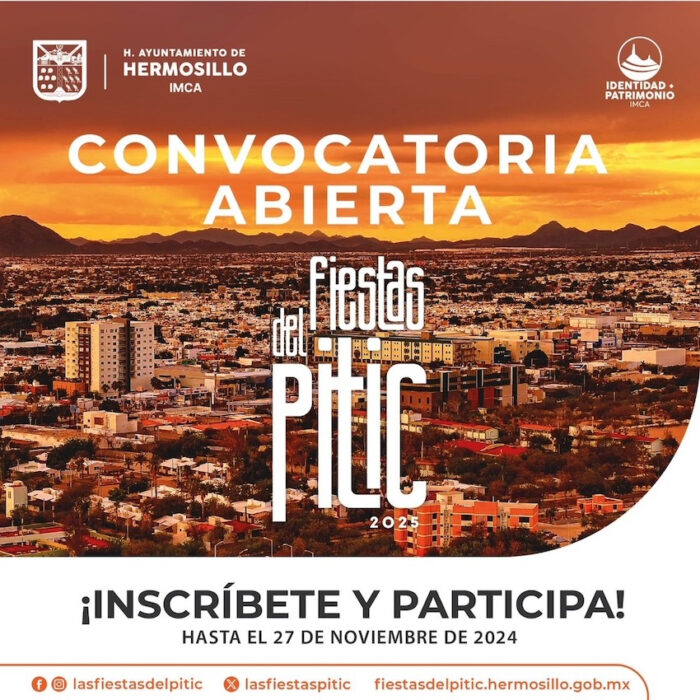 Hermosillo, Sonora.- El Ayuntamiento de Hermosillo, a través del Instituto Municipal de Cultura y Arte (IMCA), convoca a presentar propuestas artísticas, culturales y académicas para participar en la programación general, así como subsedes y Rutas Culturales de las Fiestas del Pitic 2025, que se realizarán del 22 al 25 de mayo.