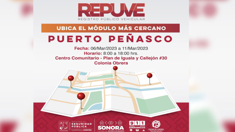 El módulo móvil del Repuve de Puerto Peñasco estará ubicado en el Centro Comunitario, en Plan de Iguala y callejón #30 de la colonia Obrera, en un horario de atención de 8:00 a 18:00 horas.