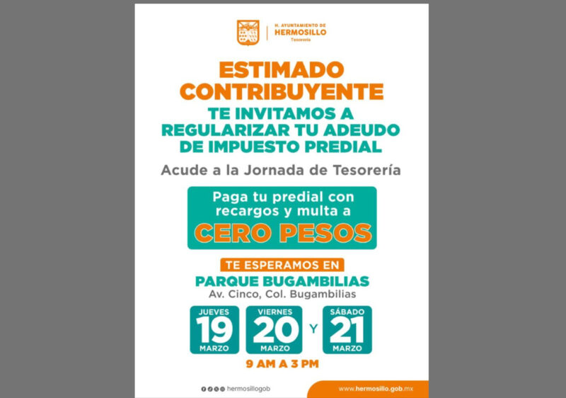 Hermosillo, Sonora.- Este jueves 19, viernes 20 y sábado 21 de marzo llegará la Tesorería Municipal con el Programa de Regularización de Predial al parque Bugambilias con grandes beneficios como cero pesos en recargos y multa, adicionalmente al 5% por pronto pago del mes de marzo.