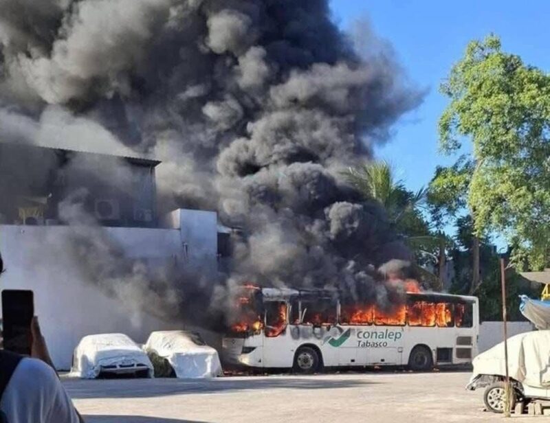 Villahermosa Tabasco.- Alumnos incendiaron un autobús escolar para exigir el pago de becas atrasadas en el plantel del Fraccionamiento Insurgentes en Villahermosa.