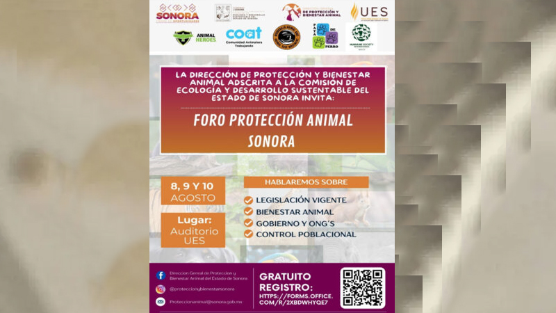 El Gobierno de Sonora anuncia el “Primer Foro de Protección Animal” en Hermosillo, el cual se llevará a cabo del 8 al 10 de agosto y es gratuito.