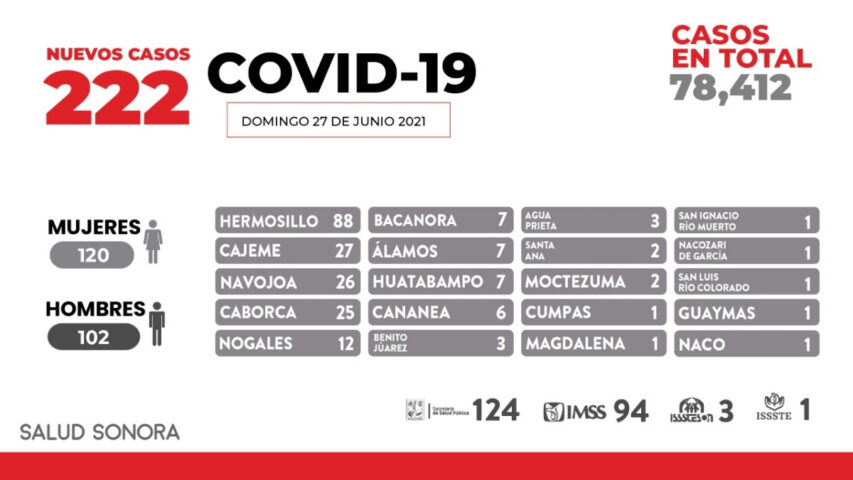Este sábado, no se confirmaron decesos en Sonora para mantenerse en un total de 6 mil 490 defunciones. Asimismo, se registraron 222 nuevos casos por COVID, en 120 mujeres y 102 hombres, para un total de 78 mil 412 casos en la entidad. De los contagios nuevos, 88 son residentes de Hermosillo; 27 de Cajeme; 26 de Navojoa; 25 de Caborca; 12 de Nogales; 7 de Huatabampo; 7 de Bacanora; 7 de Álamos; 6 de Cananea; 3 de Benito Juárez; 3 de Agua Prieta; 2 de Santa Ana; 2 de Moctezuma; una de Cumpas; una de Magdalena de Kino; una de San Ignacio Río Muerto; una de Nacozari de García; una de San Luis Río Colorado; una de Guaymas y una de Naco.