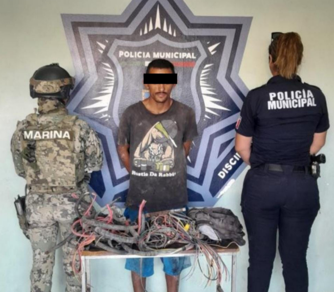 Al arribar al lugar de los hechos, los oficiales de la Policía Municipal observaron al presunto en el interior de una ambulancia de la Cruz Roja portando en sus manos un arma punzocortante, con la cual cortaba cableado que pretendía sustraer de forma ilegal, sin embargo, fue detenido rápidamente.