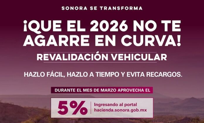 La campaña de revalidación vehicular que dio inicio el pasado 1 de enero está por concluir el próximo martes 31 de marzo, por lo que se invita a realizar el pago por medio del portal oficial: hacienda.sonora.gob.mx con opción de envío a domicilio y aprovechar el 5% de descuento.