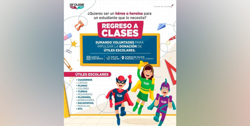 Con el firme propósito de apoyar a niñas, niños y adolescentes de escasos recursos para que puedan continuar con sus estudios y disfrutar plenamente de su tiempo escolar, el equipo de DIF Cajeme, encabezado por la Presidenta de Voluntariado, Dra. Martha Patricia Patiño Fierro, lanza la Campaña «Regreso a Clases» por tercer año consecutivo.