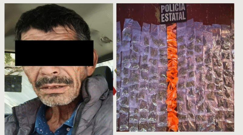 El aseguramiento se registró durante los patrullajes de vigilancia del lunes 24 de noviembre en San Pedro El Saucito, donde se efectuó la detención de Adalberto “N”, de 59 años de edad, al sorprenderlo en posesión de 180 envoltorios con sustancia prohibida.