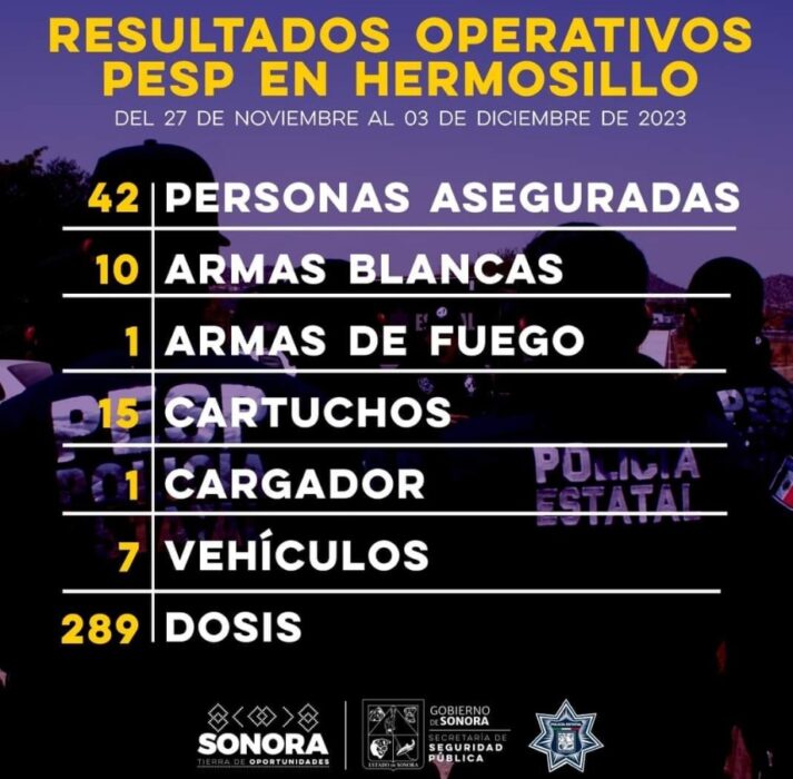 Operativo de la Policía Estatal de Seguridad Pública (PESP) en la ciudad de Hermosillo, realizó durante la última semana el aseguramiento de 42 personas, además de incautar armas y sustancias prohibidas.