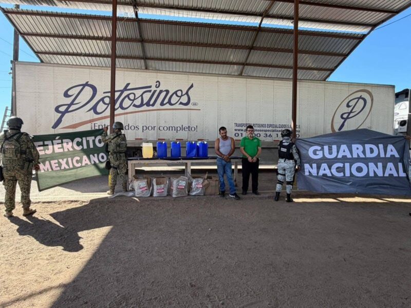 Elementos del Ejército Mexicano y la Guardia Nacional aseguraron 91 litros de presunto precursor químico utilizado en la elaboración de drogas sintéticas, durante una revisión realizada en el Puesto Militar de Seguridad Regional “Estación Doctor”, ubicado en San Luis Río Colorado.