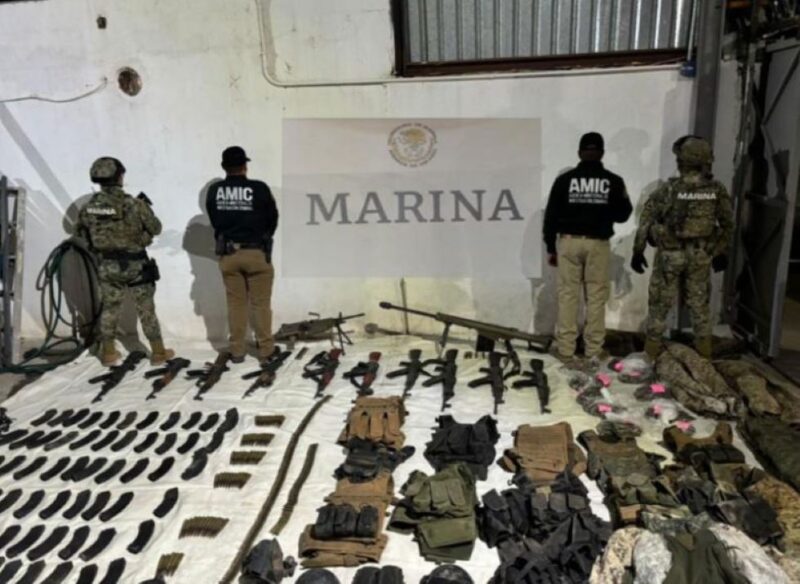 En el lugar se aseguraron 12 armas largas, una de ellas una ametralladora semiautomática modelo M249S calibre 5.56 mm; y una tipo Barret calibre .50mm; así como 10 fusiles tipo 7.62 x 39 mm.