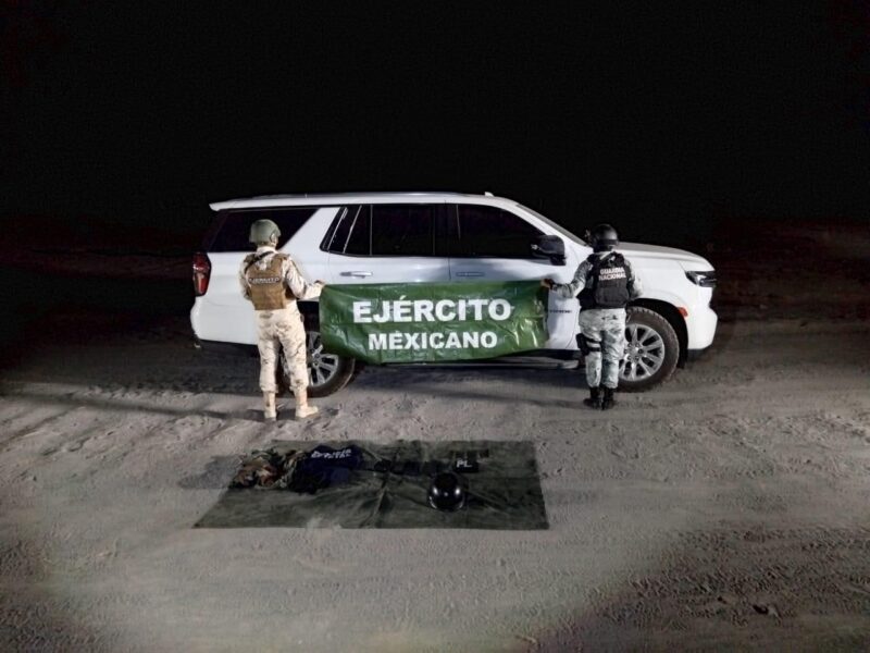 Conjuntamente, el Ejército Mexicano y la Guardia Nacional, al realizar un operativo coordinado en la colonia La Copa, en el mencionado municipio, lograron el aseguramiento de una camioneta, 38 cartuchos, seis cargadores, así como ropa y un casco táctico.