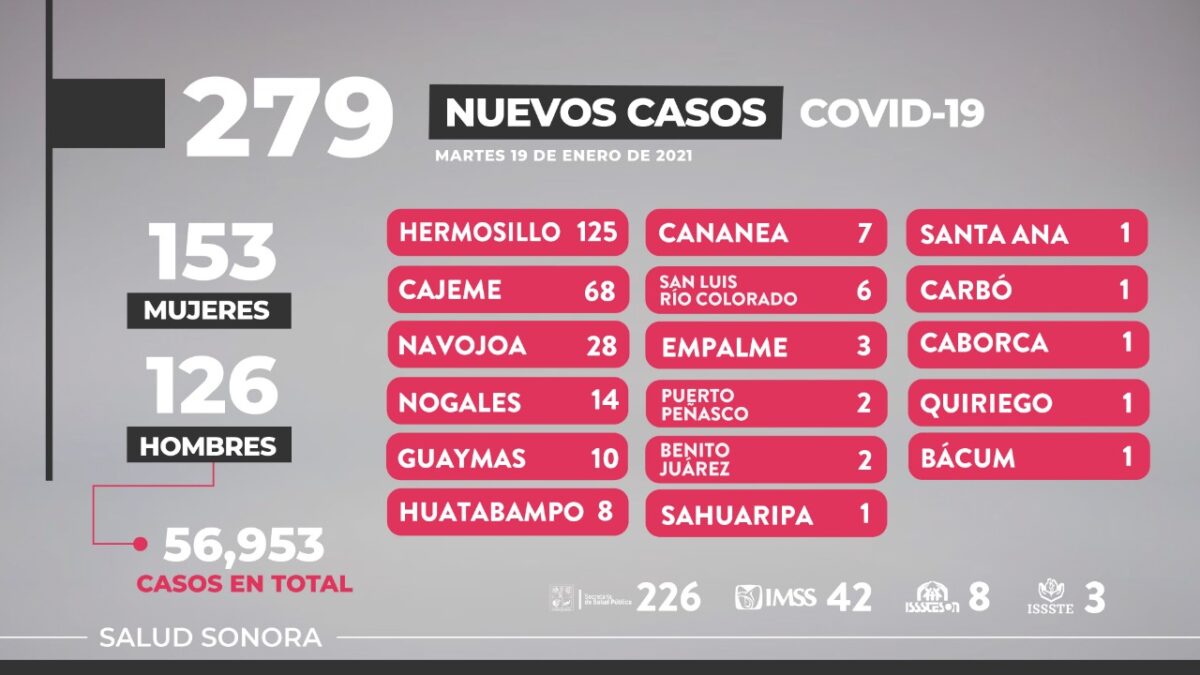Este día, se registraron 279 nuevos casos de COVID-19, en 153 mujeres y 126 hombres, para un total de 56 mil 953 casos en la entidad, 125 de los nuevos casos en residentes de Hermosillo; 68 de Cajeme; 28 de Navojoa; 14 de Nogales; 10 de Guaymas; ocho de Huatabampo; siete de Cananea; seis de San Luis Río Colorado; tres de Empalme; dos de Puerto Peñasco; dos de Benito Juárez; uno de Sahuaripa; uno de Santa Ana; uno de Carbó; uno de Caborca; uno de Quiriego y uno de Bácum.
