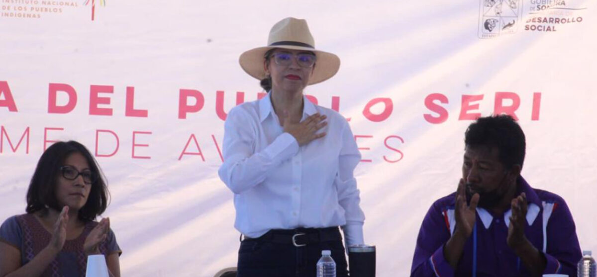 Punta Chueca, Municipio de Hermosillo, Sonora; 5 de julio de 2022.-María Wendy Briceño Zuloaga secretaria de Desarrollo Social de Sonora, Érika Poblano Sánchez, coordinadora general de Fomento a la Economía Indígena del Instituto Nacional de Pueblos Indígenas (INPI) y Joel Barnett gobernador de la nación Comcaac, encabezaron la mesa de seguimiento de acuerdos del Plan de Justicia del Pueblo Seri.