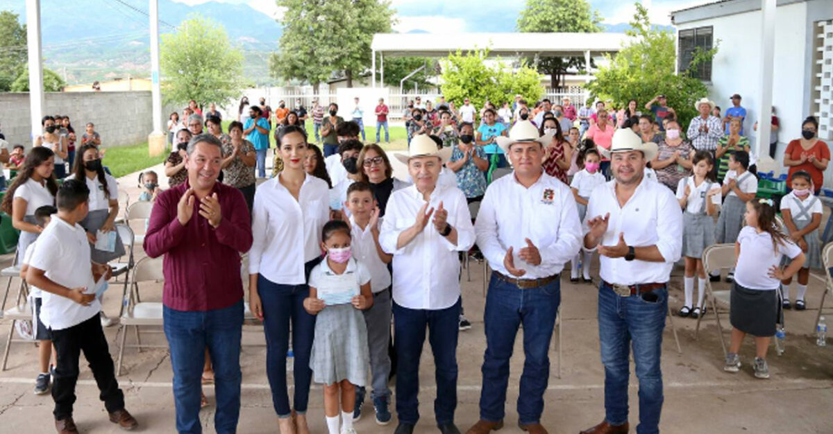 Presentes: Luis Alfonso Sierra Villaescusa, presidente municipal de Bacadéhuachi; Aarón Grageda Bustamante, secretario de Educación y Cultura; Froylán Gámez Gamboa, director del Instituto de Becas y Crédito Educativo; Carlos Zatarain González, coordinador general del Cecop; y Bernardo Ríos Cheno, diputado federal.
