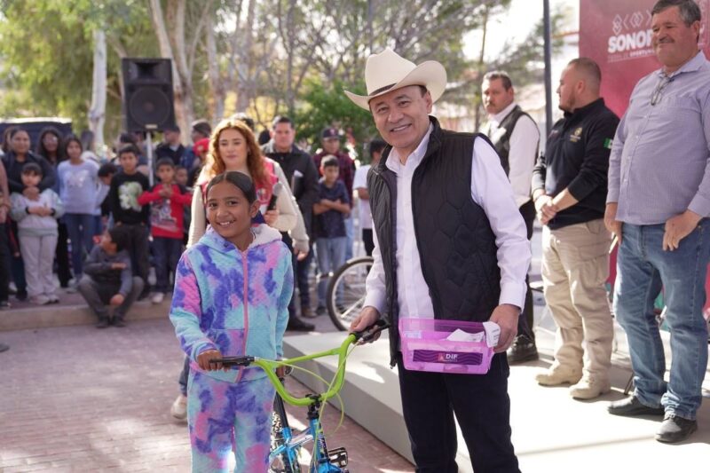 En las inmediaciones de la Plaza Hidalgo, el mandatario estatal entregó bicicletas a niñas y niños de Bavispe, además de formar parte de la posada que se celebró para todas y todos los ciudadanos de la comunidad.