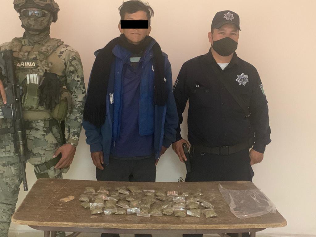Elementos de la Secretaría de Seguridad Pública Municipal en coordinación con la Secretaría de Marina durante la tarde de este jueves, en la colonia Aves del Castillo, lograron la detención de Sergio Luis “N.”, de 26 años, luego de que presuntamente portaba entre sus pertenencias 39 envoltorios de una hierba de color verde y seca, con características similares a la marihuana.