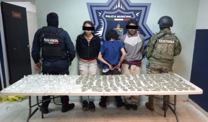 Los aprehendidos fueron identificados como María Elizabeth «N.», de 38 años; José Guadalupe «N.», de 35 años y Damian Alexis «N.», de 16 años, a quienes se les aseguraron entre sus pertenecias diversos envoltorios de una hierva de color verde y seca, así como de una sustancia granulada al tacto de color blanco.