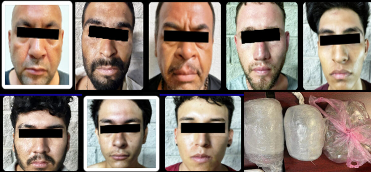 Luego de salvaguardar a la víctima, también se detuvo en el sitio a Jesús Francisco “N.”, de 23 años, Francisco Javier “N.”, de 47, Octavio “N.”, de 20, José Eduardo “N.”, de 23, Diego Hiram “N.”, de 18, Sadrak Omar “N.”, de 21, y un masculino originario de Sinaloa de 15 años de edad.