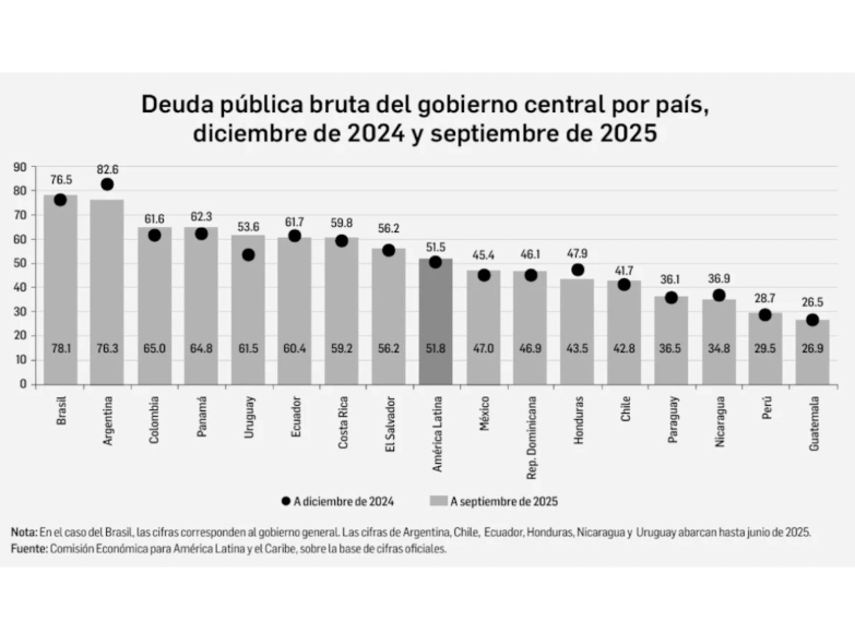 La deuda pública de los gobiernos de América Latina es elevada, hasta septiembre de 2025 representó 51.8 por ciento del producto interno bruto (PIB), una ligera variación respecto al 51.5 por ciento registrado en 2024.