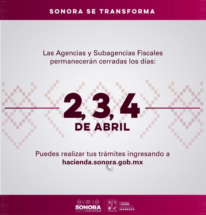 Hermosillo, Sonora; .– El Gobierno de Sonora, a través de la Dirección General de Recaudación de la Secretaría de Hacienda, informa a los contribuyentes que las 27 Agencias y Subagencias Fiscales del estado permanecerán cerradas los días 2, 3 y 4 de abril durante el periodo de asueto por Semana Santa y se reanudarán operaciones en horario normal el lunes 6 de abril.
