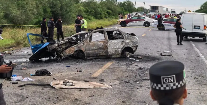 En medio de la carretera quedó calcinado un vehículo Volkswagen Jetta, y en su interior estaban los restos de dos personas cuya identidad se desconoce al no haber vestigios que permitan identificarlas.