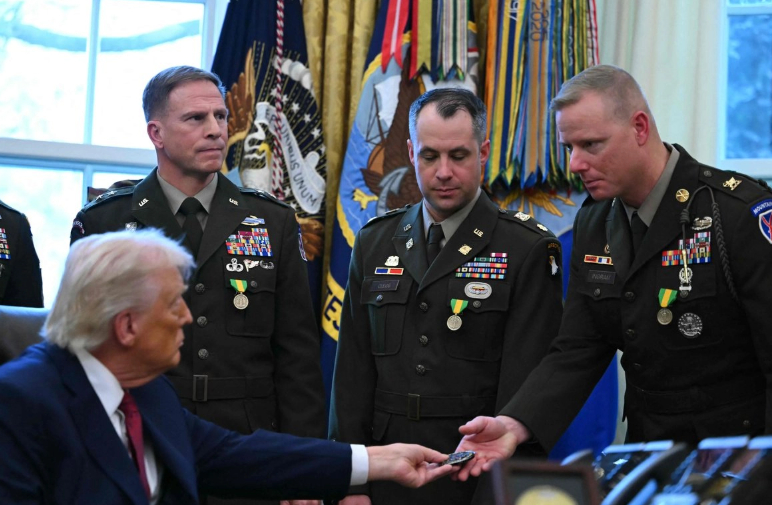 Pero estos militares condecorados fueron más bien un trasfondo fotográfico para el comandante en jefe, después de recibir sus medallas, Trump pidió que los militares se pusieran alrededor del escritorio presidencial para tomar una fotografía.