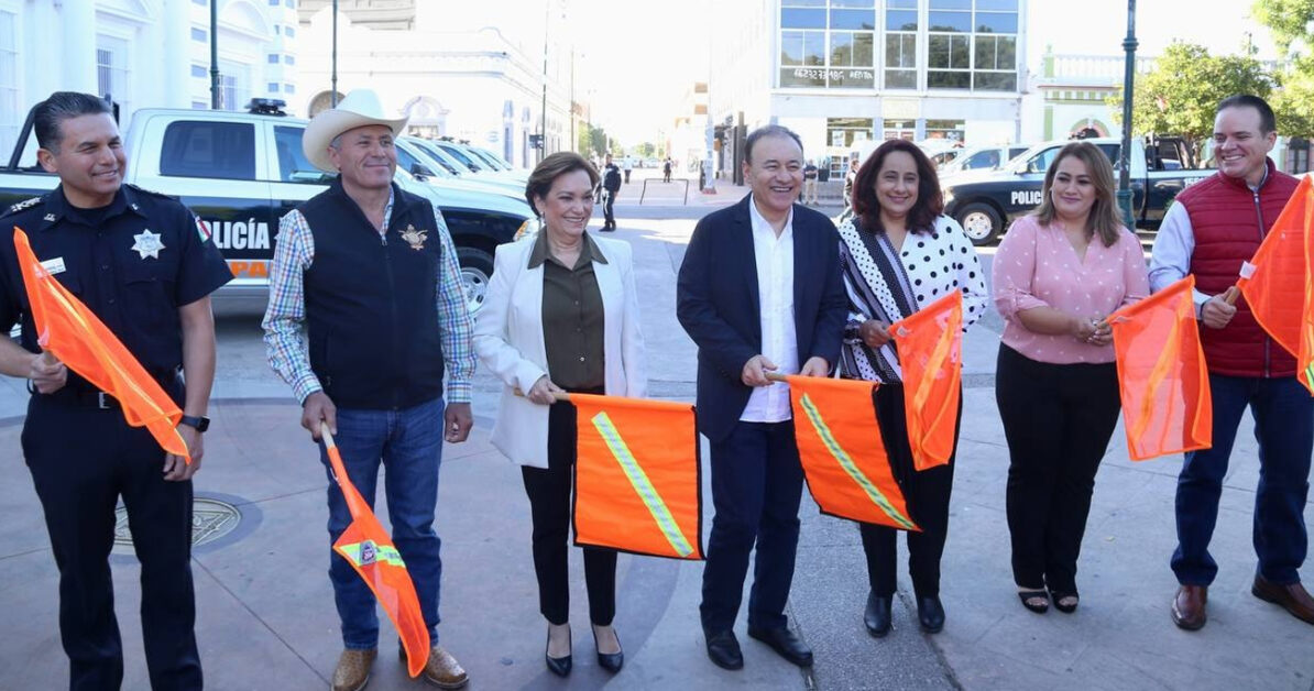 Presentes: Roberto Leyva Lerma, comisario general de la Coordinación Estatal de la Policía Estatal de Seguridad Pública; Jorge Luis Portillo Arvizu, presidente municipal de Nácori Chico; Arabela García Quijada, presidenta municipal de Tepache; y Miguel Obed Robinson Bours del Castillo, presidente municipal de Villa Pesqueira.