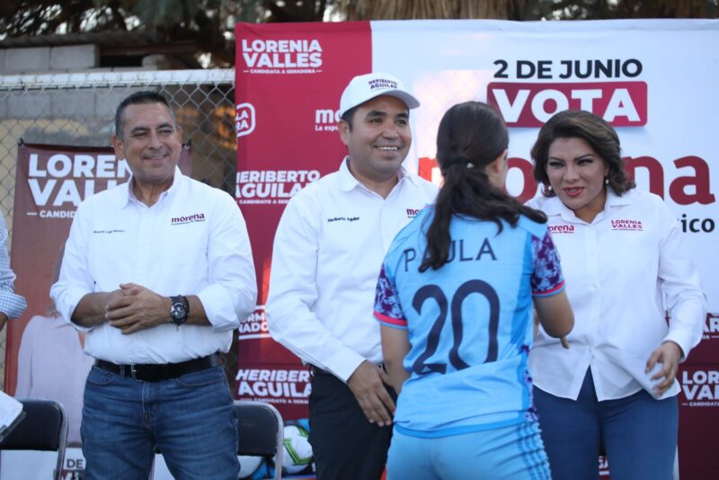 En el parque de fútbol de La Sauceda, Aguilar Castillo, junto con su compañera de la fórmula ganadora Lorenia Valles Sampedro, dijo que ahora sí el deporte será para todos y todas, ahora que llegue el gobierno municipal de Morena.