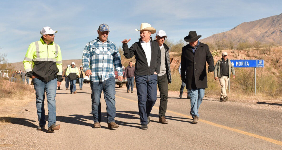“La carretera está completamente terminada de Agua Prieta a la Colonia Morelos. Este es el acceso a Colonia Morelos, entrando de Bavispe. Vean ustedes qué buen trazo. Se hicieron obras complementarias de banqueta y alguna contención de aguas, aquí viene una acequia; en fin, creo que también le da una gran dignidad a Colonia Morelos», dijo.