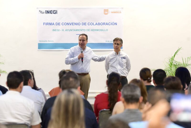 Hermosillo, Sonora; 25 de agosto, 2023.- Para que personal del Ayuntamiento de Hermosillo reciba capacitaciones, talleres y apoyo técnico y tecnológico por parte del Instituto Nacional de Estadística y Geografía (INEGI), el Presidente Municipal, Antonio Astiazarán Gutiérrez, firmó un convenio marco de colaboración con Guillermo Ornelas Romero, director regional de esa institución.