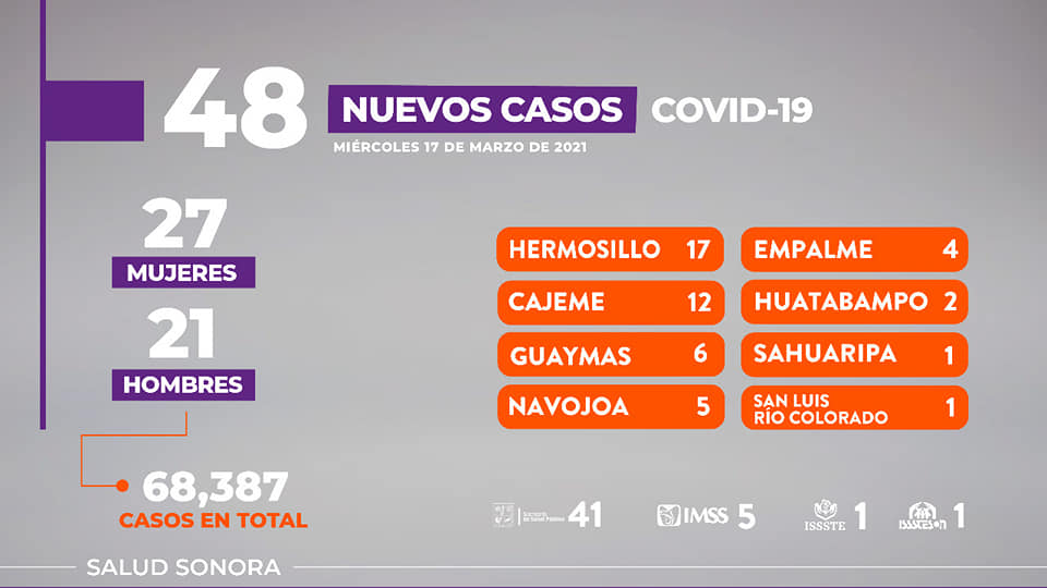 Hoy se suman 48 nuevos casos en 27 mujeres y 21 hombres, acumulándose 68 mil 387 casos en total desde el inicio de la pandemia; los nuevos pacientes son residentes de: Hermosillo 17; Cajeme 12; Guaymas 6; Navojoa 5; Empalme 4; Huatabampo 2; Sahuaripa y San Luis Río Colorado 1 cada uno.