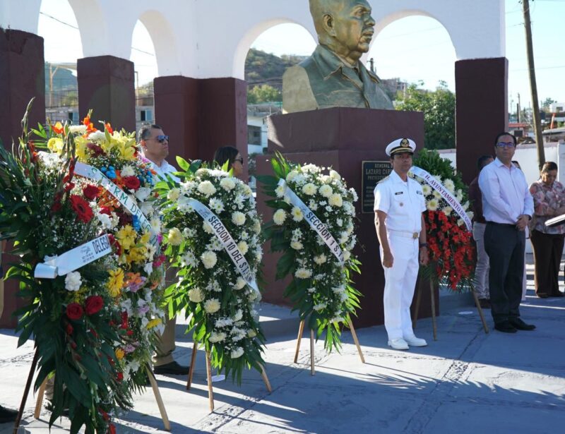 En representación de la alcaldesa, doctora Karla Córdova González, el secretario del Ayuntamiento, Herman Aaron García Luna, acompañado de Gregorio Otero Carmona y los representativos de las secciones 01 Marinos, 10 Marinos, delegación 65 sección 40 y Delegación 11 sección 40, encabezó la colocación de ofrenda floral y guardia de honor en el monumento a Cárdenas del Río.