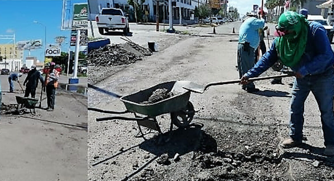 CIUDAD OBREGÓN, SONORA. 10 DE SEPTIEMBRE DE 2022.- Luego de los estragos que se han presentado con las lluvias en los últimos días y que dejaron las vialidades destrozadas cuadrillas de Bacheo pertenecientes a Desarrollo Urbano y de Imagen Urbana y Servicios Públicos del Ayuntamiento de Cajeme, trabajan intensamente desde la mañana de este sábado sobre las principales vialidades de la ciudad.