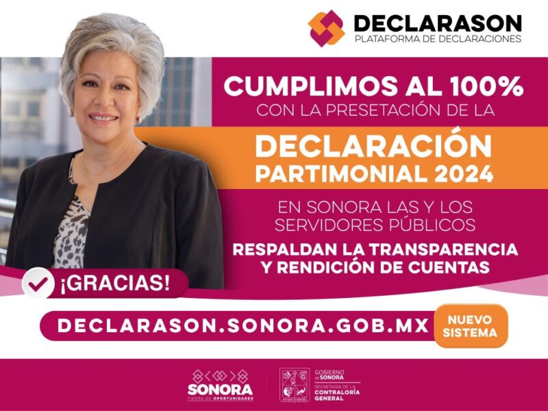Hermosillo, Sonora; 17 de agosto de 2024.- El Gobierno de Sonora, a través de la Secretaría de la Contraloría General, informó que por primera vez el 100 por ciento de los 62 mil 622 servidoras y servidores públicos que conforman la totalidad de la administración estatal, cumplieron con la presentación de su declaración patrimonial y de intereses en su modalidad de modificación 2024.
