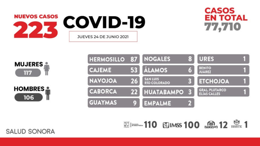 Asimismo, se registraron 223 nuevos casos por COVID, en 117 mujeres y 106 hombres, para un total de 77 mil 710 casos en la entidad. De los contagios nuevos, 87 son residentes de Hermosillo; 53 de Cajeme; 26 de Navojoa; 22 de Caborca; nueve de Guaymas; ocho de Nogales; seis de Álamos; tres de San Luis Río Colorado; tres de Huatabampo; dos de Empalme; uno de Ures; uno de Benito Juárez; uno de Etchojoa y uno de General Plutarco Elías Calles.