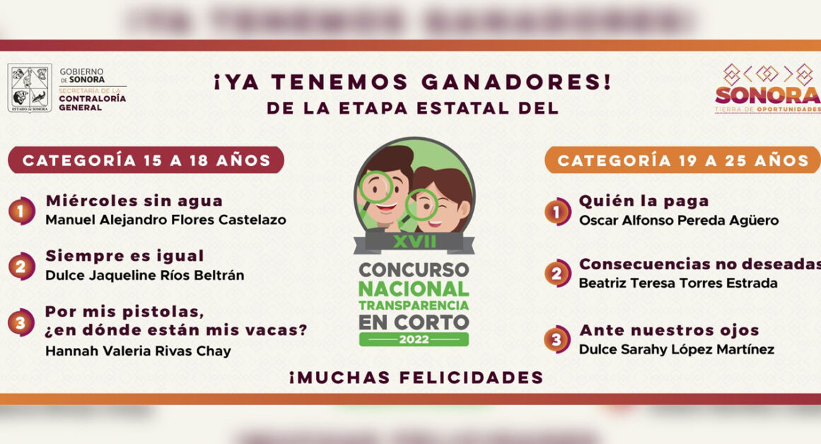 Como parte del seguimiento a la convocatoria de la décima séptima edición del Concurso Nacional de Transparencia en Corto, iniciativa en la que las juventudes expresaron sus ideas en un cortometraje de hasta 90 segundos, la Secretaría de la Contraloría General, a través de su jurado, definió a las y los ganadores en su etapa estatal.