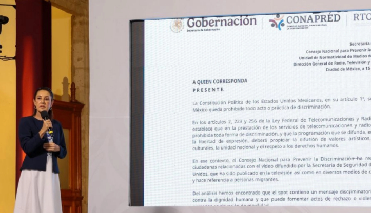 Ciudad de México. La presidenta Claudia Sheinbaum Pardo se dijo en desacuerdo con la transmisión en televisión abierta mexicana de un anuncio publicitario de la administración de Donald Trump en contra de los migrantes, pues “tiene contenido discriminatorio muy alto”.