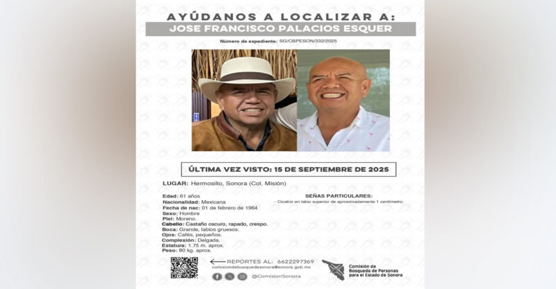 Francisco Palacios Esquer, ex secretario del Ayuntamiento de Empalme, fue reportado como desaparecido desde el pasado lunes 15 de septiembre en la ciudad de Hermosillo.