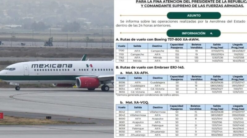 Según el reporte de vuelos de Mexicana que esta mañana exhibió el presidente Andrés Manuel López Obrador, la aerolínea despachó ayer un vuelo Acapulco-AIFA con un solo pasajero, mientras que en la ida solo vendió ocho lugares en un avión con 50 espacios disponibles.