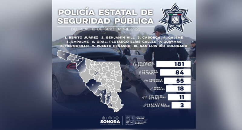 Oficiales de la Policía Estatal de Seguridad Pública (PESP) detuvieron a 55 personas en una semana de acciones para la prevención y combate al delito en municipios de Sonora.