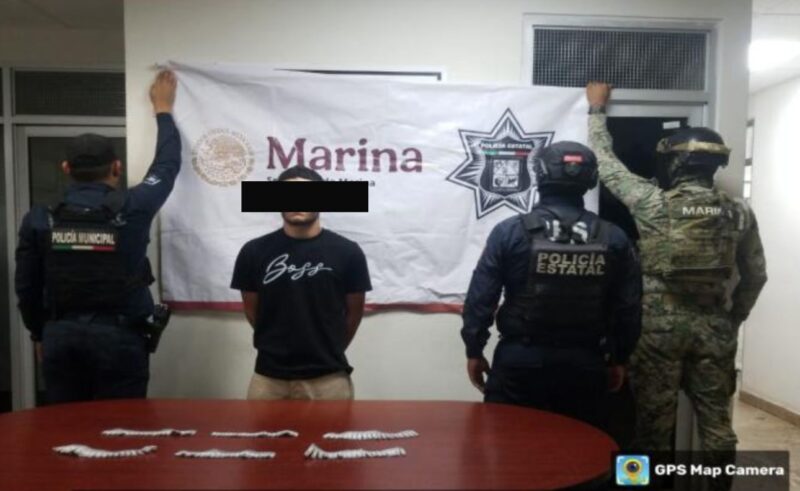 Mientras se realizaban labores de vigilancia y prevención del delito sobre el bulevar Emiliano Zapata, en la colonia Centro de la Comisaría de Pueblo Yaqui, se detuvo a Manuel Guadalupe «N.», de 39 años de edad, a quien se le aseguró una bolsa de plástico que contenía 13 envoltorios con una sustancia blanca granulada con características similares a un narcótico.