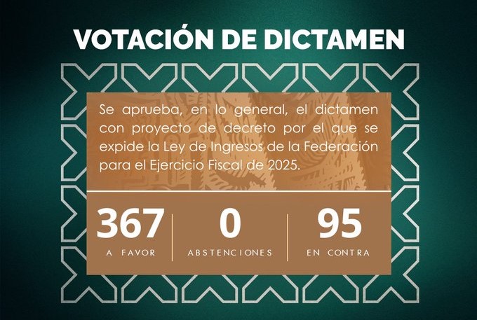 La Cámara de Diputados aprobó en lo general el dictamen con proyecto de decreto por el que se expide la Ley de Ingresos de la Federación para el Ejercicio Fiscal de 2025.