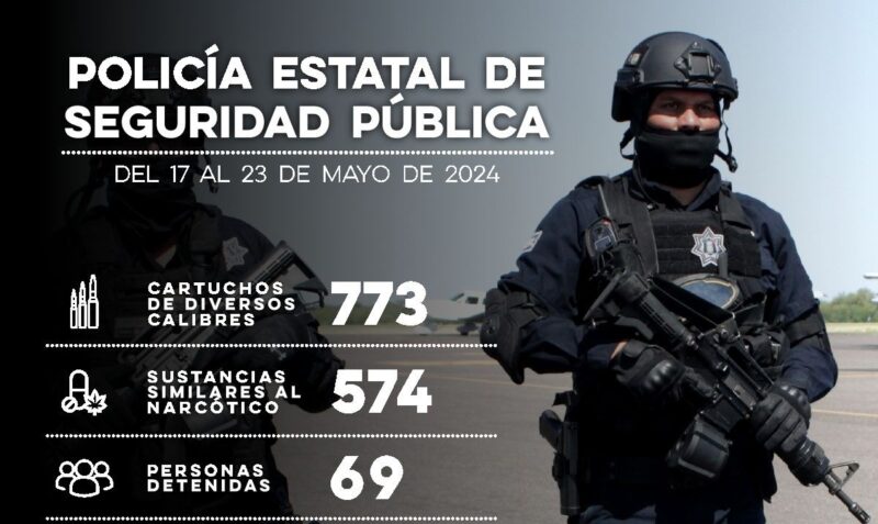 En la semana del 17 al 23 de mayo, la corporación en coordinación con las autoridades de seguridad de los tres niveles de gobierno aseguraron a un total de 69 personas por flagrancia delictiva, además, recuperaron 16 vehículos con reporte de robo, incautaron 574 envoltorios de sustancias similares al narcótico, 773 cartuchos y 11 armas de fuego.