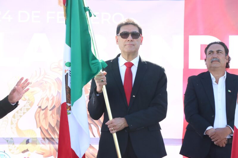 Nogales, Sonora; 24 de febrero de 2026.– En el marco del Día de la Bandera, el alcalde Juan Francisco Gim Nogales presidió la ceremonia de abanderamiento de 14 escoltas, pertenecientes a igual número de escuelas de nivel primaria, secundaria y preparatoria.