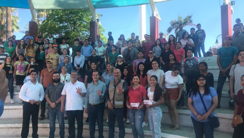 Navojoa, Sonora, 12 de julio 2023.- Tarjetas del programa “Jóvenes construyendo el futuro” recibieron 146 beneficiarios de Navojoa quienes durante un año recibirán el apoyo de beca para la capacitación en el trabajo, en un evento presidido por las autoridades municipales y Secretaría del Bienestar.