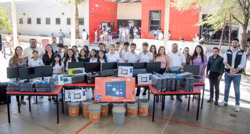 En total, el plantel recibió 33 computadoras para el Centro de Cómputo, ocho cubetas de pintura para las aulas, material para equipar el taller de Producción Industrial, y seis reflectores LED para aumentar la seguridad de las instalaciones.
