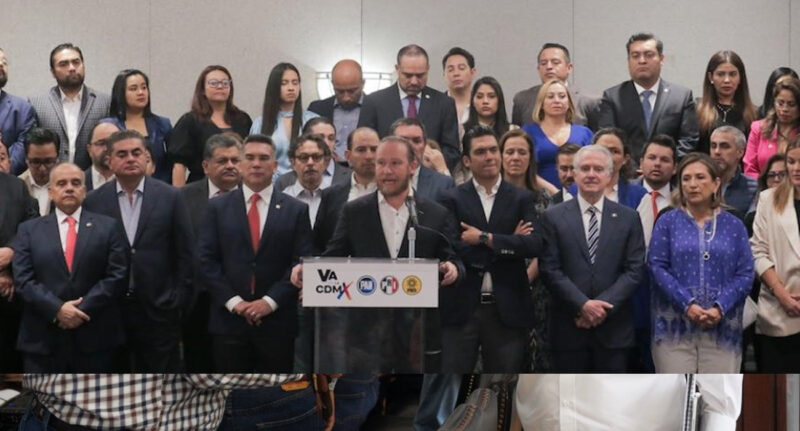 Arropados por los líderes nacionales y más políticos de los tres partidos, el alcalde Santiago Taboada y el coordinador de Acción Nacional en la Cámara de Diputados, Jorge Romero, anunciaron la presentación de denuncias por espionaje, tortura y otros delitos ante la Fiscalía General de la República (FGR), por considerar que la Fiscalía General de Justicia de la Ciudad de México (FGJCDMX) emprendió una persecusión en su contra bajo órdenes de Morena y el gobierno capitalino.