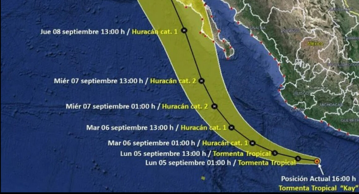 De acuerdo con el reporte del clima del Sistema Meteorológico Nacional, este 04 de septiembre al medio día el centro de la Tormenta Tropical “Kay” se localiza frente a las costas de Michoacán y Guerrero, su amplia circulación originará lluvias fuertes a muy fuertes sobre entidades del centro del territorio nacional, con lluvias intensas a puntuales torrenciales en zonas del occidente y sur del país, además de vientos fuertes y oleaje elevado en las costas de Jalisco, Colima, Michoacán, Guerrero y Oaxaca.