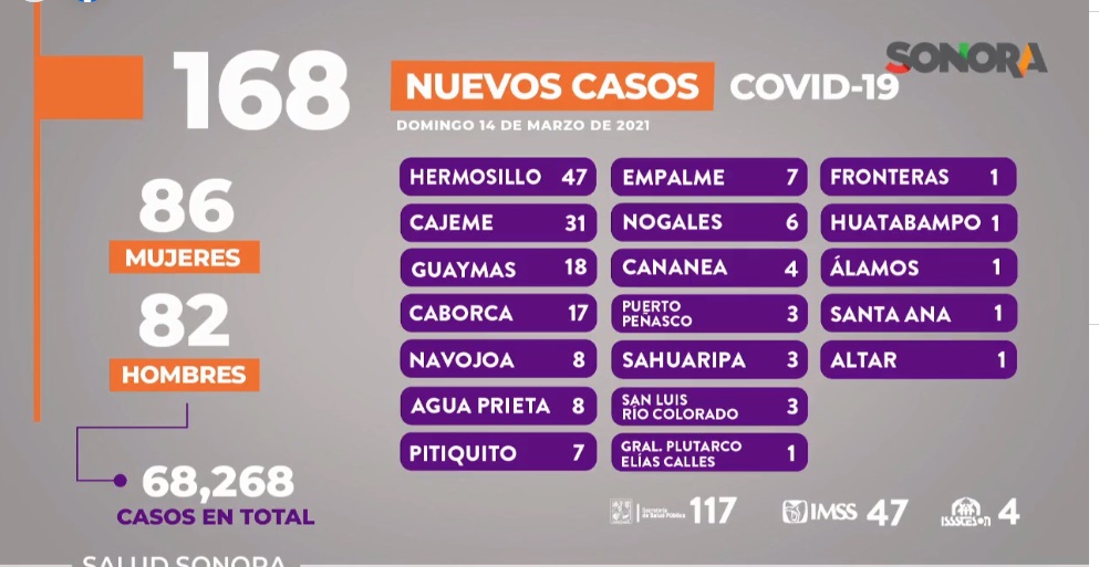 Este domingo se sumaron 168 nuevos casos, en 86 mujeres y 82 hombres; acumulándose 68 mil 268 casos en total desde el inicio de la pandemia en el estado; los nuevos pacientes son residentes de Hermosillo 47; Cajeme 31; Guaymas 18; Caborca 17; Navojoa y Agua Prieta ocho cada uno; Pitiquito y Empalme siete cada uno; Nogales seis; Cananea cuatro; Puerto Peñasco, Sahuaripa y San Luis Río Colorado tres cada uno; General Plutarco Elías Calles, Fronteras, Huatabampo, Álamos, Santa Ana y Altar uno cada uno.