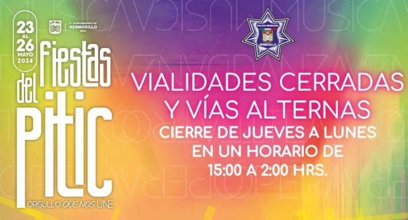Hermosillo, Sonora; 21 de mayo, 2024.- El Departamento de Tránsito Municipal exhorta a la ciudadanía a circular con precaución y hacer uso de vías alternas ante el cierre de vialidades durante el desarrollo de las Fiestas del Pitic 2024, que se llevarán a cabo del jueves 23 al domingo 26 de mayo.