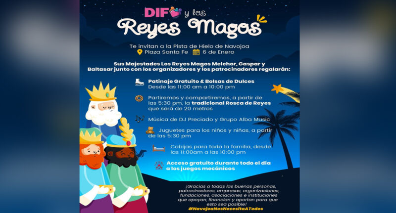 DIF Navojoa y los Reyes Magos, con el apoyo de varios patrocinadores, invitan a las familias navojoenses a disfrutar gratuitamente de la pista de hielo y partir la Rosca de Reyes el 6 de enero en la Plaza Santa Fe.